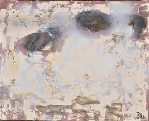 山本弘「種畜場」、油彩、F30号(天地72.7cm×左右91.0cm) 1978年制作。画家が住んでいた長野県上郷町(現飯田市)に、家畜の種付け場があった。大型動物の受精場だ。牛や山羊などの交配をしていた。そこを描いたものだという。 飯田市近郊は天竜川の流域に…
