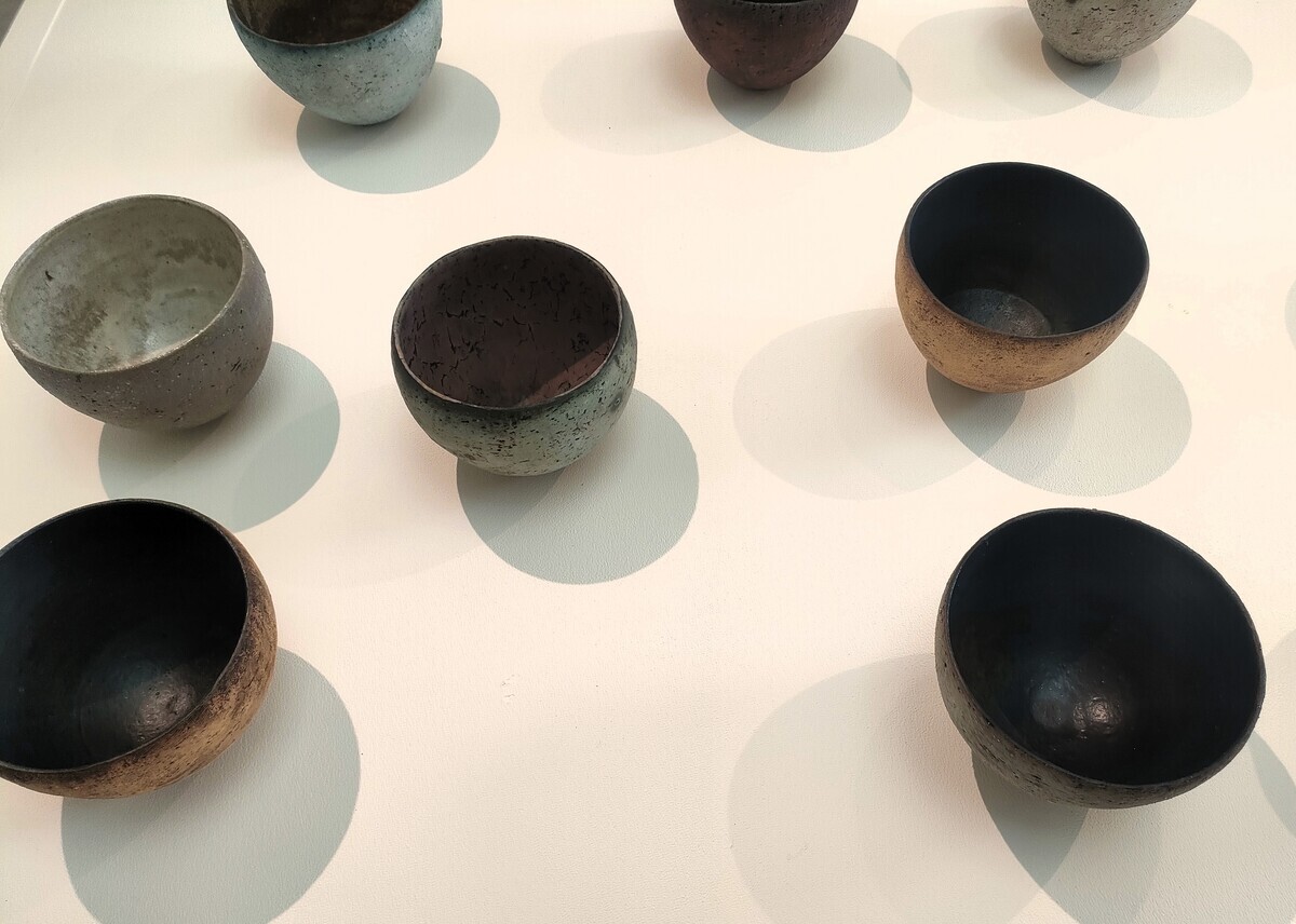 今回は蜜蝋画と焼物を展示している。1階に展示されている焼物の破れたラグビーボールのようなオブジェがとても面白い。2階には実用の皿と球のような碗が展示されている。この碗がとても魅力的だった。深くて薄いので実用に供して壊れないかと尋ねると、鷹尾は高温で焼き締めているので丈夫なのだと言う。ちょっと欲しいと思ってしまった。