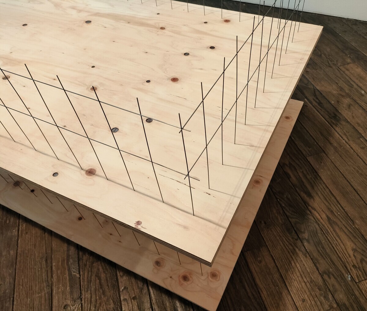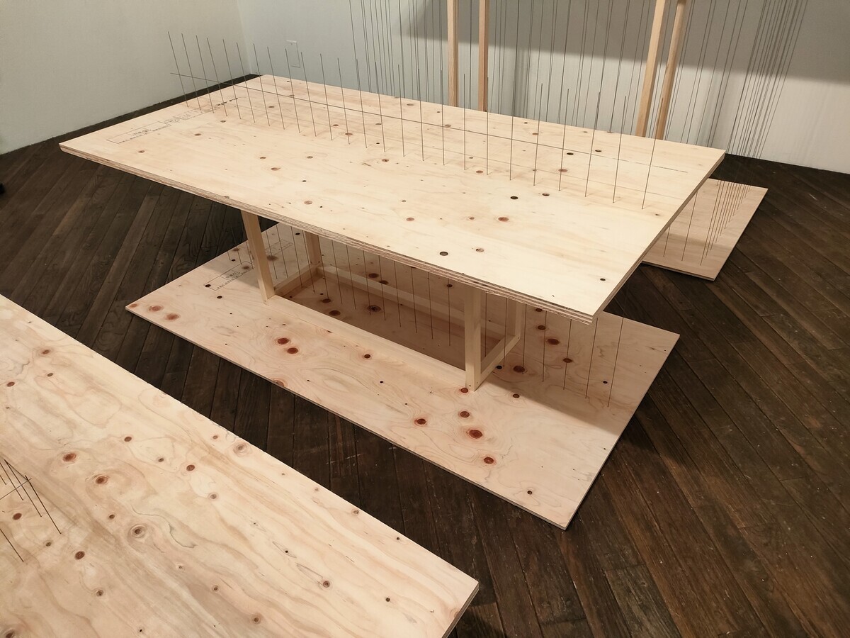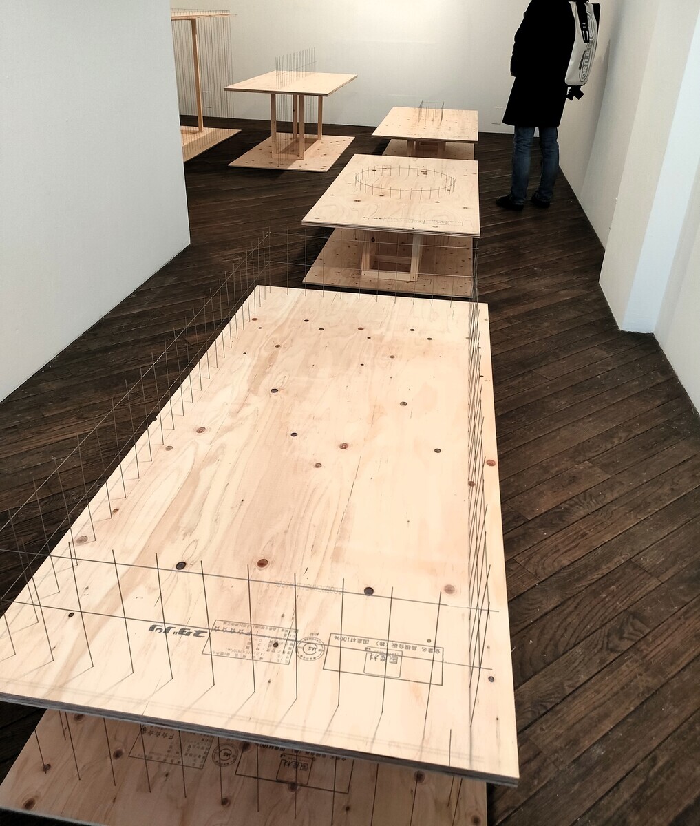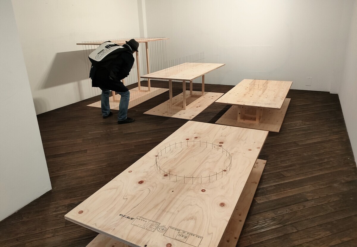 ギャラリーには5つの大型作品が並んでいる。いずれも三六の分厚い合板2枚を天板と底板のように離して重ね、そこに細い鉄線を刺し通している。作品はギャラリーの奥に行くに従って階段状に高くなっている。