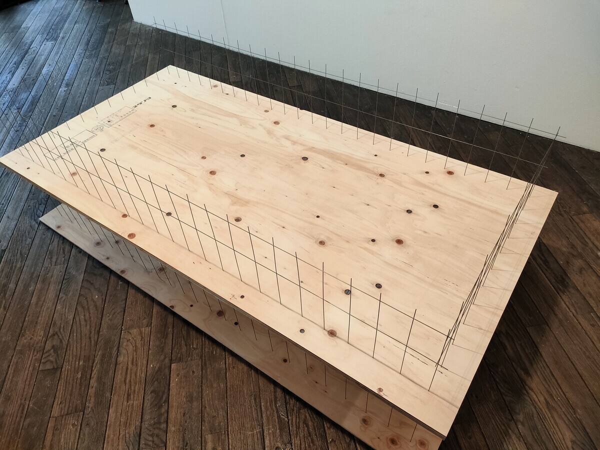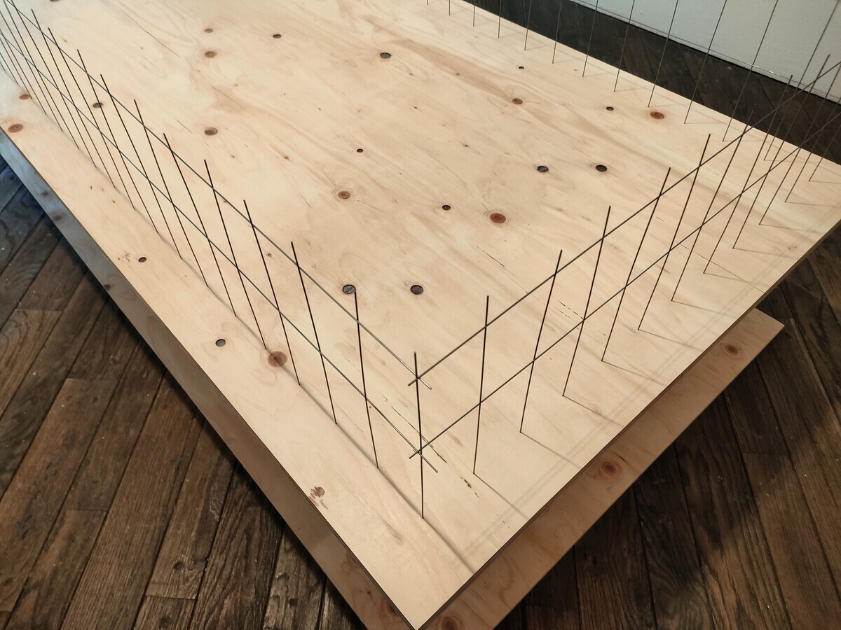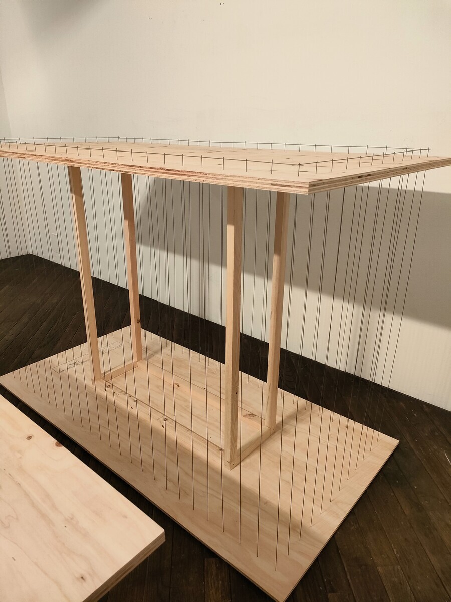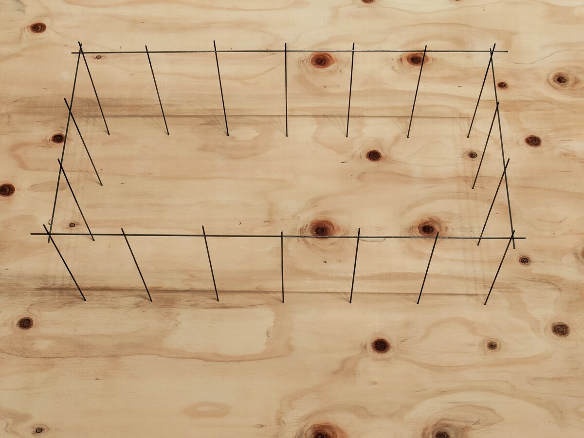 ギャラリーには5つの大型作品が並んでいる。いずれも三六の分厚い合板2枚を天板と底板のように離して重ね、そこに細い鉄線を刺し通している。作品はギャラリーの奥に行くに従って階段状に高くなっている。